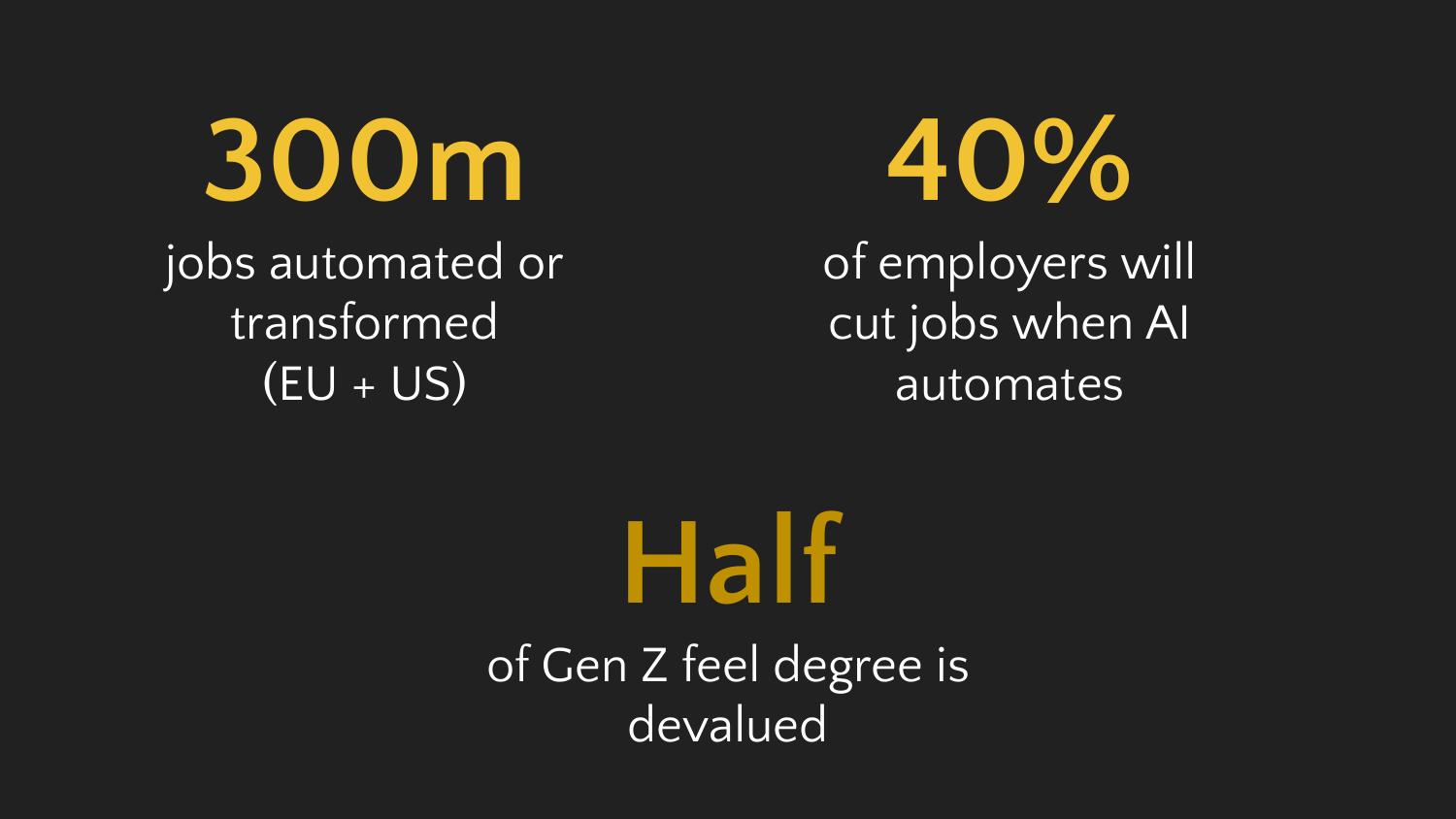 And this isn’t just Irish. Goldman Sachs predicts 300 million jobs in the US and Europe will be automated or transformed by AI. The World Economic Forum found 40% of employers expect to cut staff where AI can automate. Almost half of Gen Z say they already feel their degree is worth less because of AI.